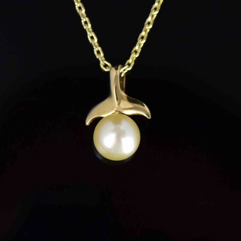 Tucked onto the end of a solid 10 karat yellow gold whale tail, a magnificent Na Hoku pearl demands attention in this vintage pendant necklace. With its playful and chic design, it’s sure to become a favorite in your jewelry collection!
