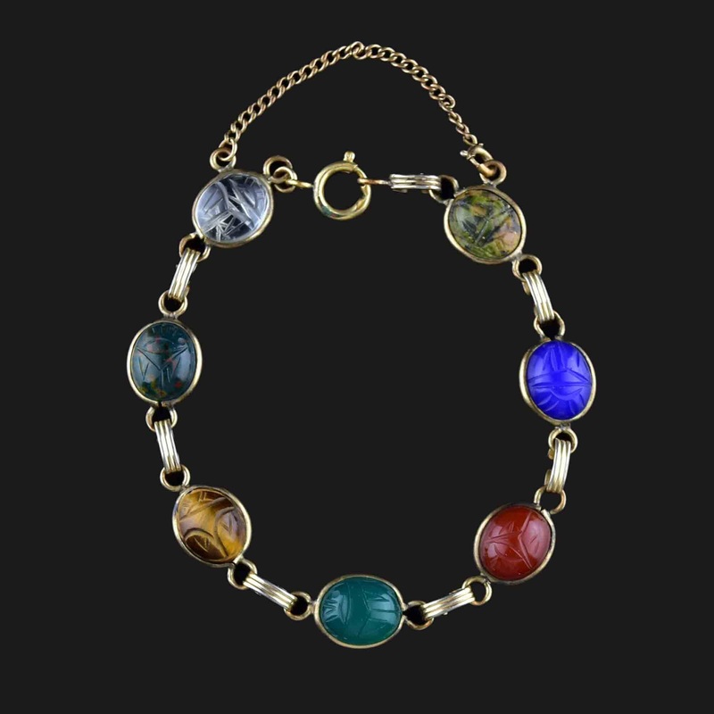 Enticing vintage scarab bracelet crafted from 12K yellow gold fill and adorned with an array of quartz gemstones. These include agate, bloodstone, carnelian, green and blue chalcedony, and tigers eye carved into beetle bugs that are then wrapped around the band and connected with a ribbed bar. Vibrant hues of brown, green, blue and red are showcased. The bracelet closes with a delicate spring ring and is in excellent condition considering its age. A must-have for lovers of Classic Egyptian Revival fashion and Retro jewelry!