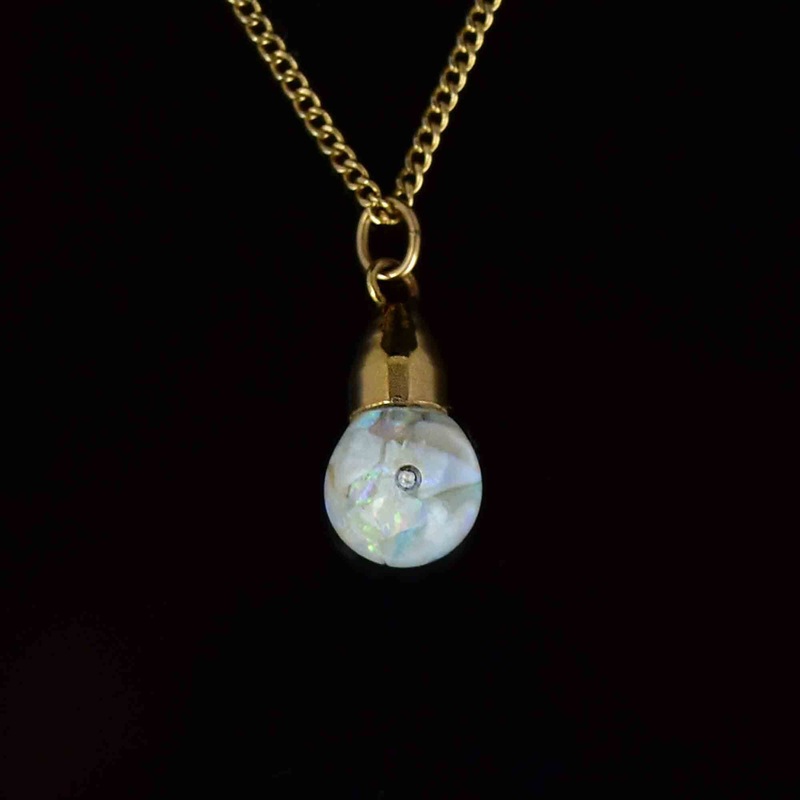 This whimsical 12k gold-filled pendant necklace from the mid-century features a glass orb filled with liquid and floating opal chips. The opal chips create a dreamy pastel palette of blue, pink, purple, and green. This one-of-a-kind piece of jewelry is in excellent condition, with no visible imperfections.