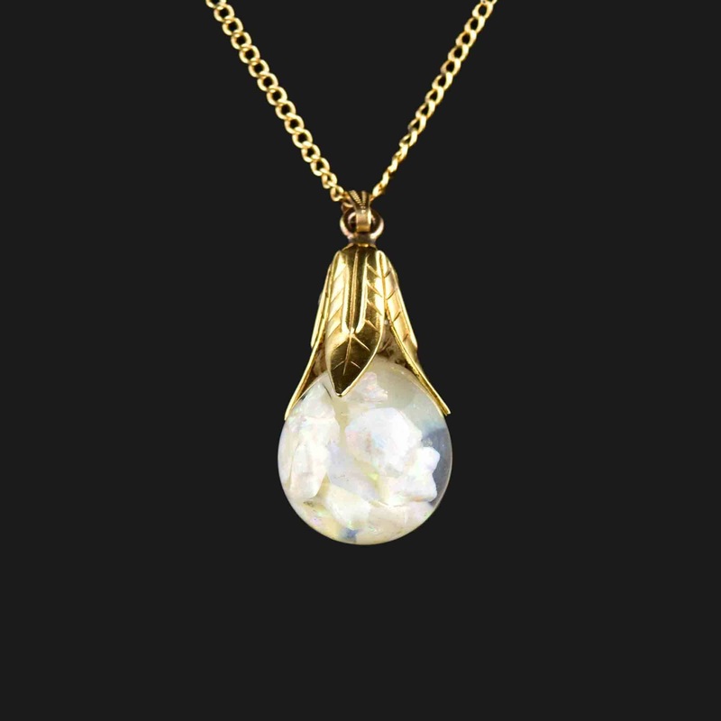 This necklace is crafted from 12 karat gold and features a charming, mid-century design. The pendant is a glass orb that contains liquid and opal chips, creating a mesmerizing effect. The opal chips come in various pastel colors, including blue, pink, purp