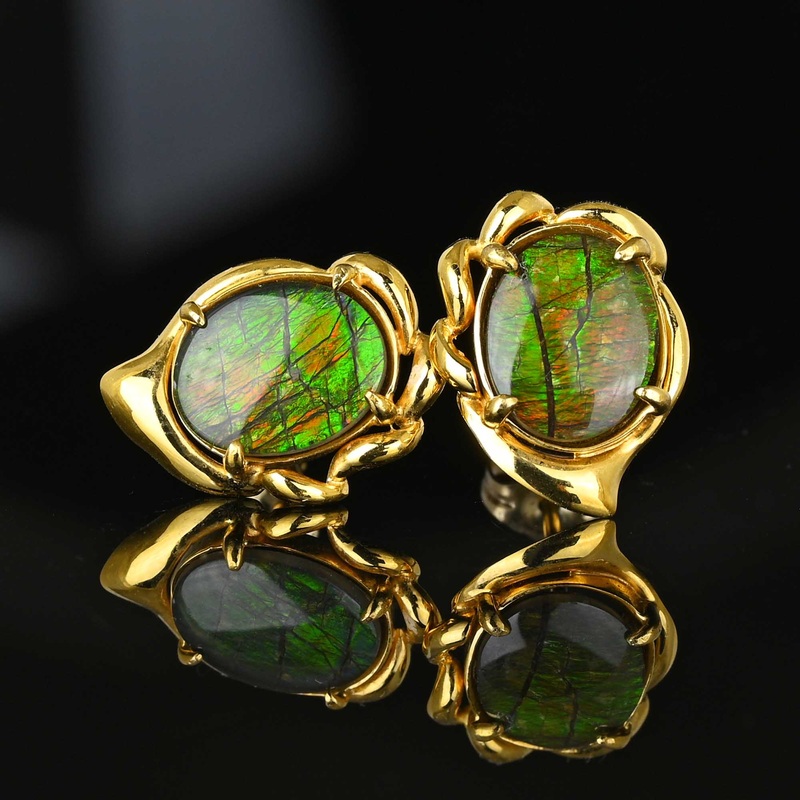 Indulge in the exquisite elegance of these vintage stud earrings, adorned with iridescent ammolite gemstones set in luxurious 14K yellow gold. These mesmerizing green stones, reminiscent of fire agate and opals, display stunning shades of emerald green, bu