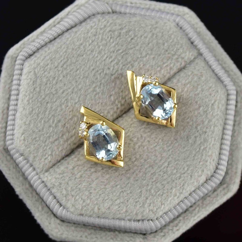 Vintage 14K Gold Aquamarine Diamond Stud Earrings