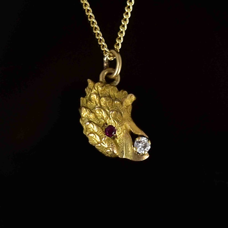 Vintage 14K Gold Diamond Ruby Eagle Head Pendant Necklace