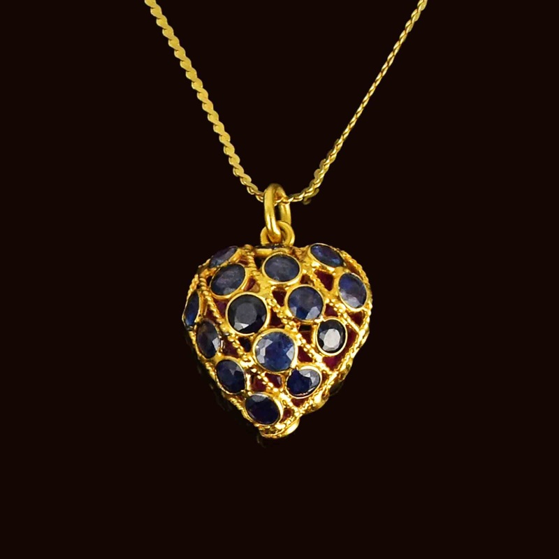Vintage 14K Gold Filigree Ruby Sapphire Heart Pendant Necklace