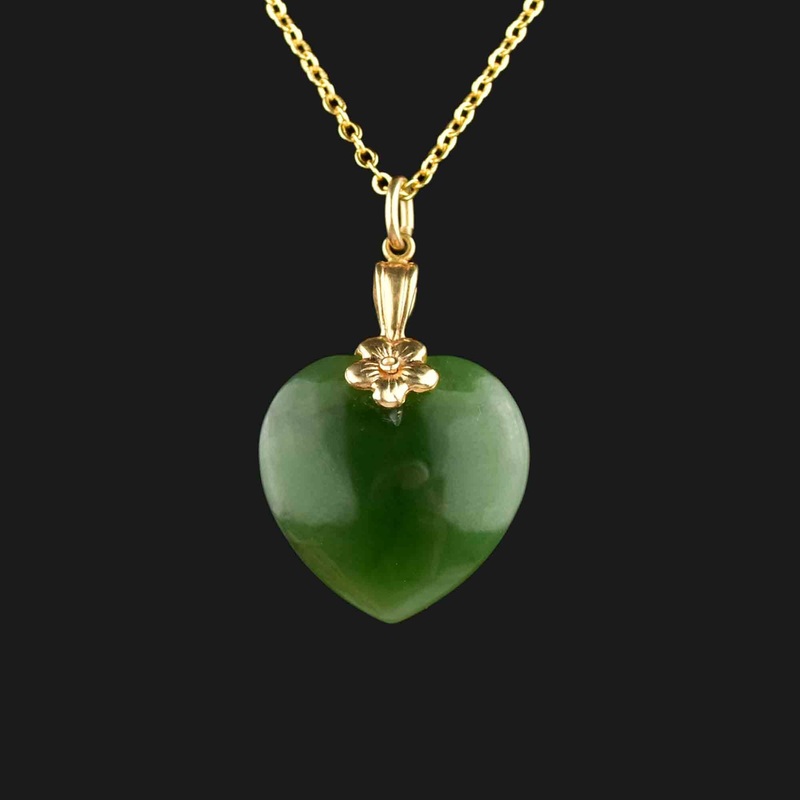 Vintage 14K Gold Floral Jade Heart Pendant Necklace