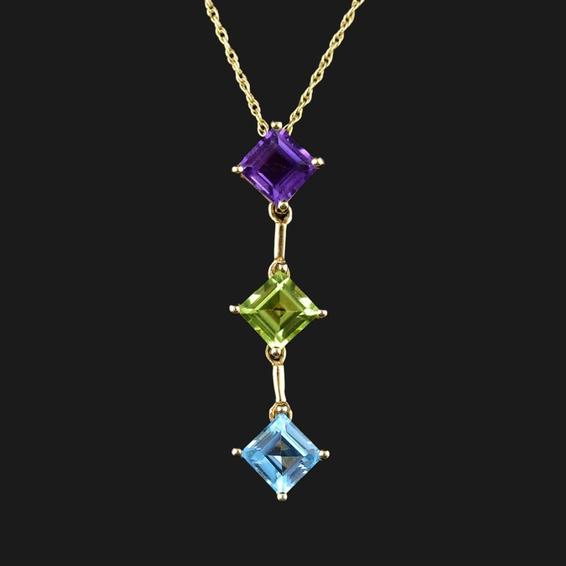 Get ready to turn heads with this stunning multi-stone 14K gold pendant necklace! Featuring princess cut peridot, topaz, and amethyst stones, its open backed design allows the vibrant colors to shine through. The solid gold bars connecting each stone add a touch of elegance. This necklace is the perfect gift for a special birthday celebrant or that special someone!