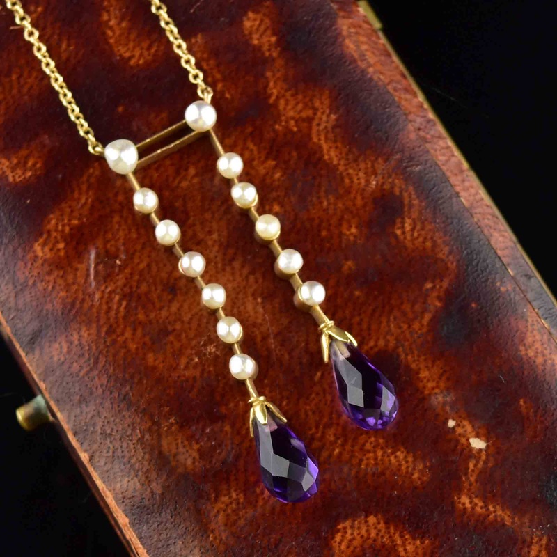 This exquisite lavaliere pendant necklace, crafted in 14K gold and adorned with natural amethyst and seed pearl accents, originates from the early 1900s. Its delicate design showcases two faceted amethyst stones connected by articulated gold bars encrusted with seed pearls. The sophisticated and refined aesthetic makes it an ideal February birthday gift, or for those who appreciate the color purple.
