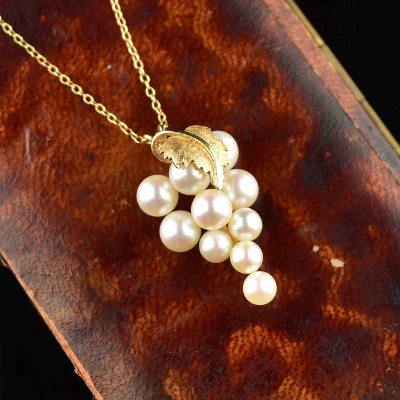 A delightful and classic pearl cluster pendant necklace! Let the classic shatter your style rut with an exquisite design reminiscent of a grape bunch, topped with a gorgeous 14k gold leaf, all exquisitely crafted for a timeless look. Magnifique!Video avail