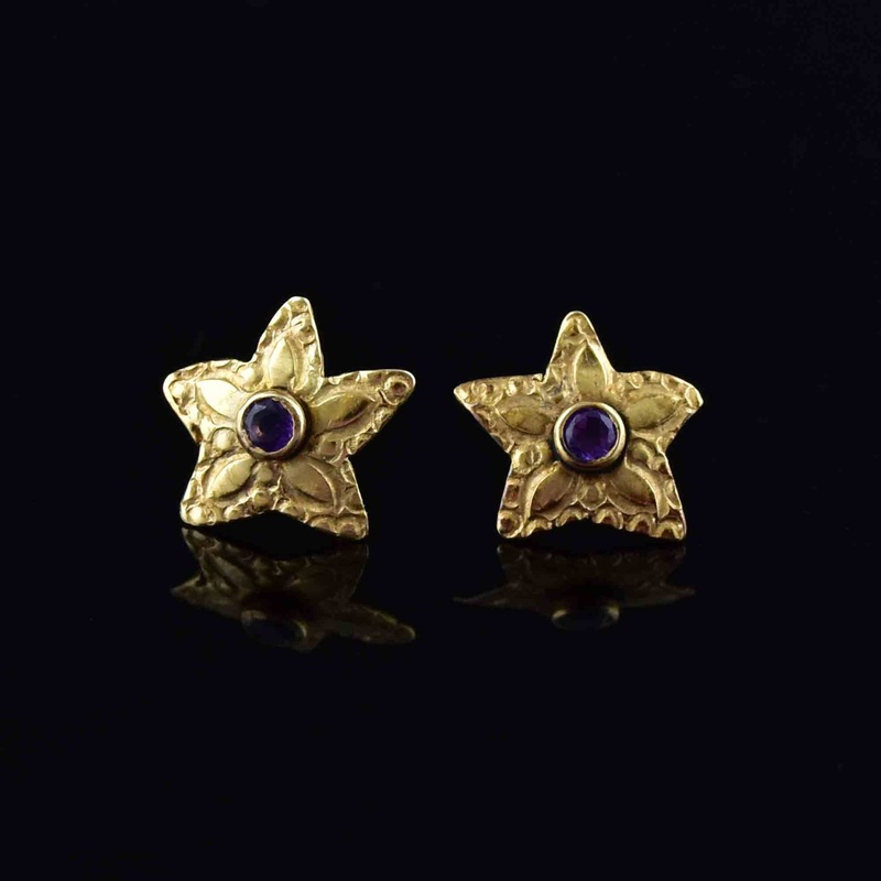 Add a playful touch to your outfit with our elegant gold star earrings. Expertly designed with 14 karat yellow gold and featuring a stunning natural purple amethyst stone at the center, these earrings are perfect for making a statement.Video available here