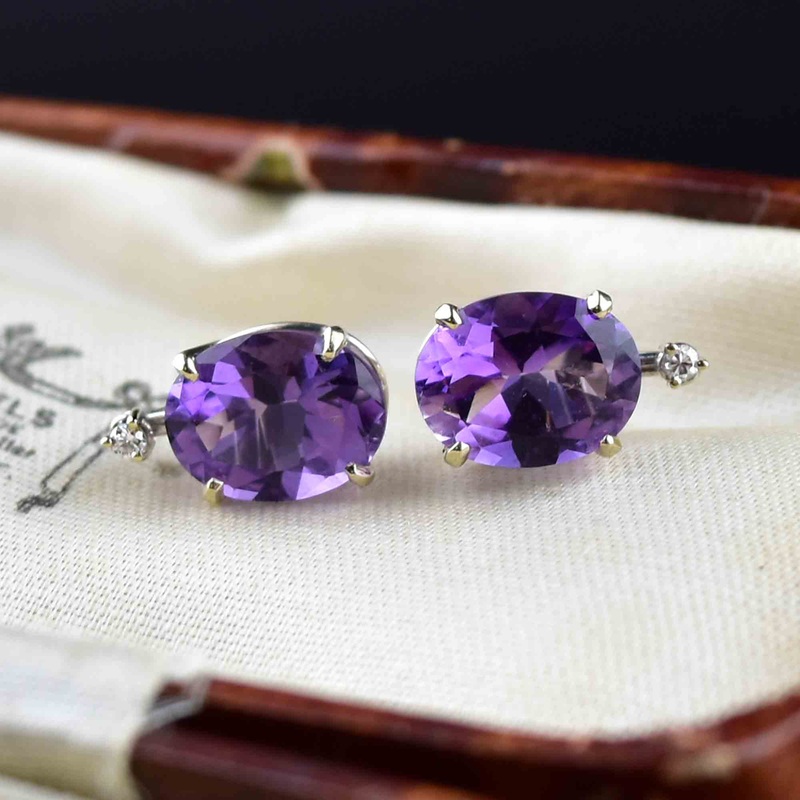 Gemstone: Natural amethyst – the stones measure 7.1mm by 9.1mm – 3 carats. Diamonds measure 1.5mm round.