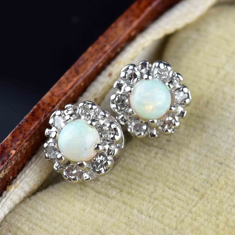 Vintage 14K White Gold Diamond Halo Opal Stud Earrings