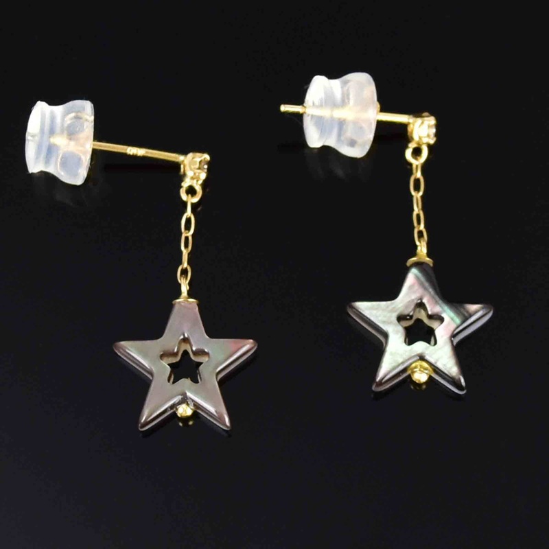 Introducing these charming vintage star drop earrings! A delightful combination of a mother of pearl star and a sparkling diamond on a solid 18 karat yellow gold post. The reversible design, with one side in iridescent black and the other in white, adds a