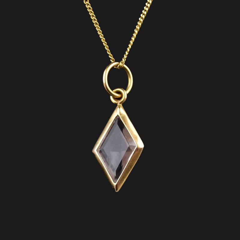 A playful and stylish vintage pendant necklace featuring a shimmering faceted rock crystal quartz stone set in an 18K gold frame. The geometric design allows for easy layering or bold solo wear.Video available here... https://youtube.com/shorts/ZiwH9Bko4Fc