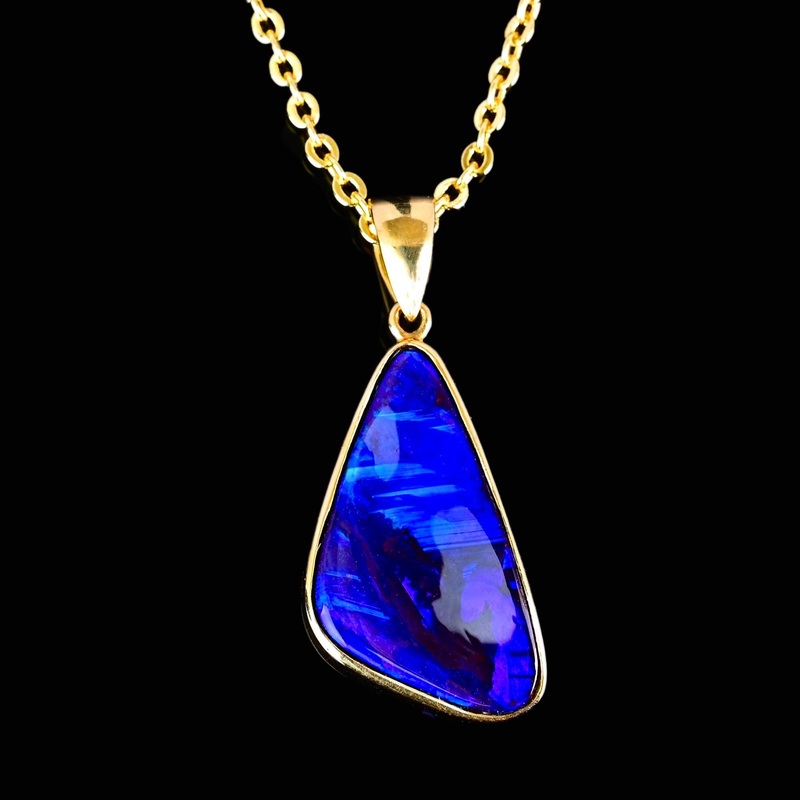 Adorned with vibrant shades of electric blue and rich purple, this one-of-a-kind boulder opal pendant flaunts a free-form design encased in 18K gold. The natural 3.84-carat opal cabochon is nestled in a bezel of lustrous gold, revealing its natural hues on the reverse side. It’s the perfect choice for an anniversary, wedding, or birthday gift that will never be forgotten