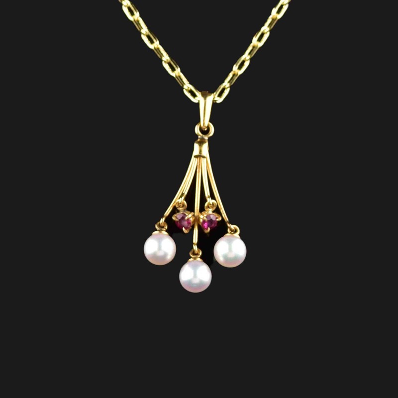 The product is a stunning pendant necklace with three pearls and pink spinel stones set in 18 karat yellow gold. Its elegant and timeless design makes it a must-have for any jewelry collection.