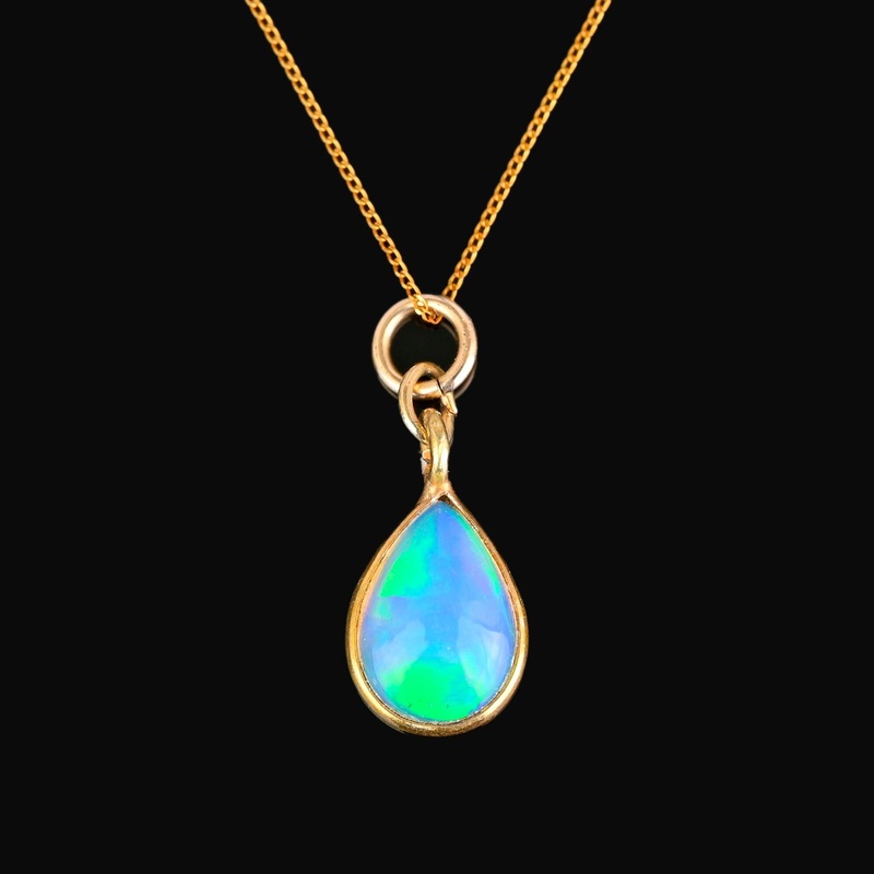This exquisite pendant necklace showcases a vibrant teardrop shaped jelly opal set in gold gilt silver and hung from a delicate 9K gold chain. The opal’s iridescent tones dance and shine in all types of lighting, making for a stunning display