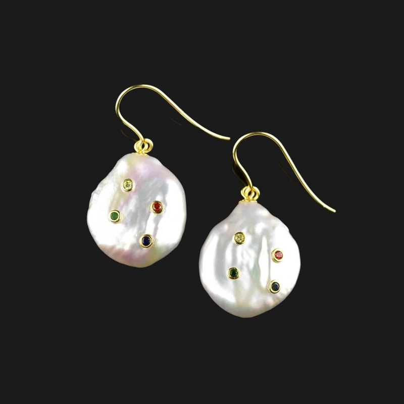 Expertly crafted with a fun and chic design, these vintage 9K gold baroque pearl drop earrings are an extraordinary addition to any accessory collection. Each large baroque pearl features a stunning display of multi colored quartz gemstones embedded on the front, while the back remains solid. With 9K gold ear wires, these one-of-a-kind earrings exude timeless beauty. Perfect for any occasion, these vintage earrings are a must-have for any jewelry lover.