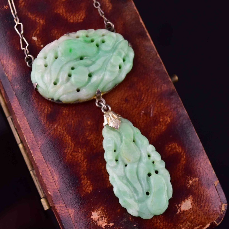 Vintage Art Deco Carved Natural Jade Pendant Necklace