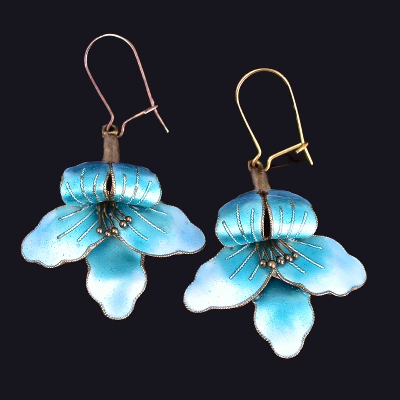 A charming and sentimental set of vintage Laurel Burch orchid earrings! These Art Nouveau inspired drop earrings showcase a stunningly intricate electric blue enamel orchid flower drop with ornate center detailing on a silver gold vermeil base. With their
