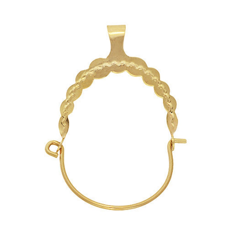 This vintage charm holder pendant is crafted in 14k yellow gold. This lovely charm holder features a romantic scalloped edge wreath design at the top and bail that can accommodate your favorite chain up to 2 millimeters in width.
