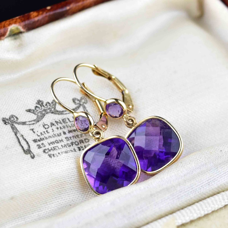 Vintage Cushion Cut Amethyst Drop Earrings in 14K Gold