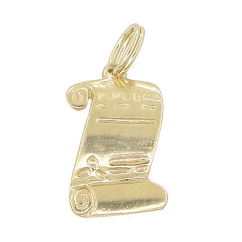 Celebrate that long awaited special graduation day with this beautiful estate diploma charm. Crafted in high polish 14K yellow gold, this pendant is perfect for engraving that memorable date. Measuring 7/8 inch high by 1/2 inch wide, it features a 14K yellow gold split ring bail that makes this pendant perfect to wear on a favorite neckchain or easily and securely attaches this charm to a charm bracelet. The perfect gift for your favorite graduate, this pendant is sure to delight for years to come!