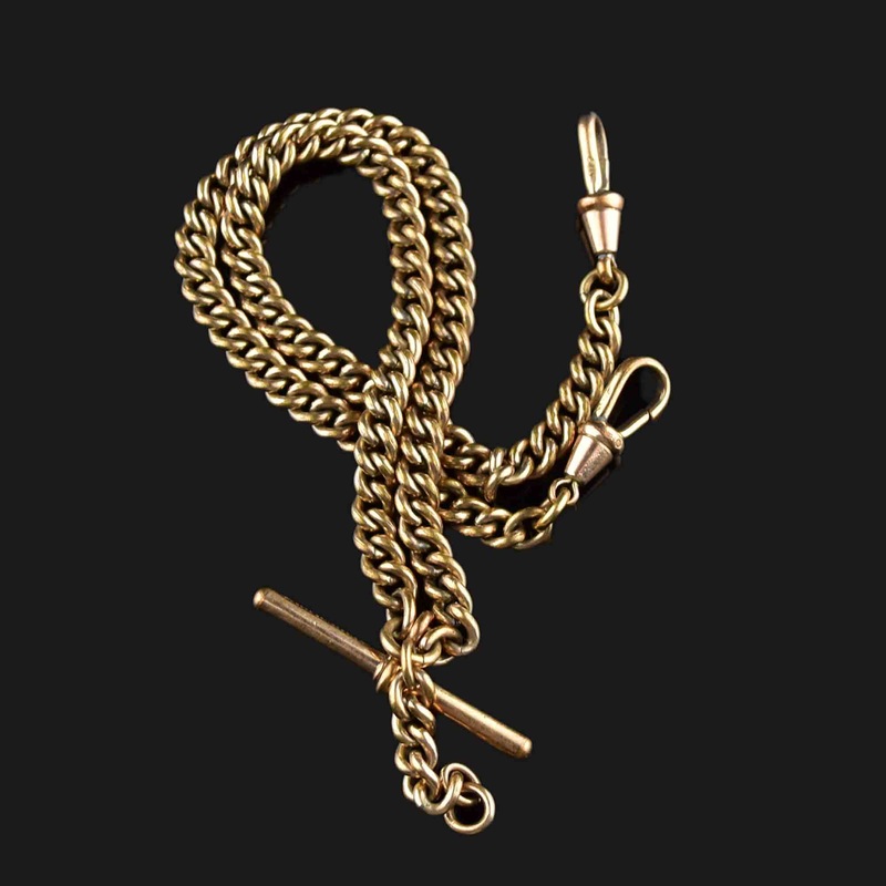 An enthralling antique Victorian double Albert pocket watch chain crafted from lavish rolled gold, ideal for use as a necklace or bracelet. The elegant curb chain, fitted with a central T-bar and accompanying dropper, is perfect for attaching a pocket watch for the gentleman, or it can be worn around the neck for the ladies – a stylish way to add an individual touch!
