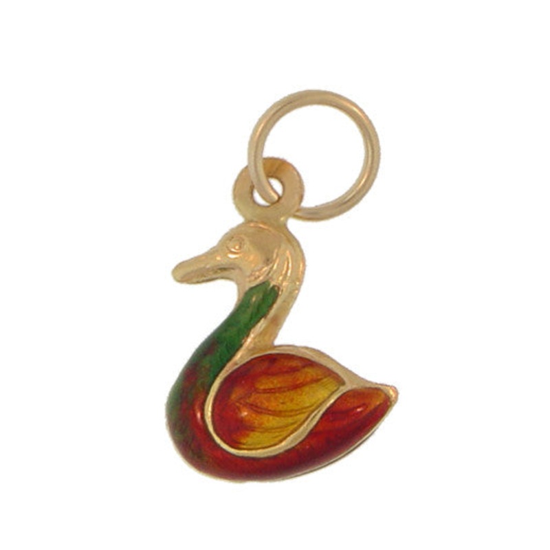 This wonderful vintage duck charm is crafted in 18K yellow gold with colorful enamel on the duck body. This unique 18K yellow gold duck charm measures 1/2 inch wide by 3/4 inches high including the bail.