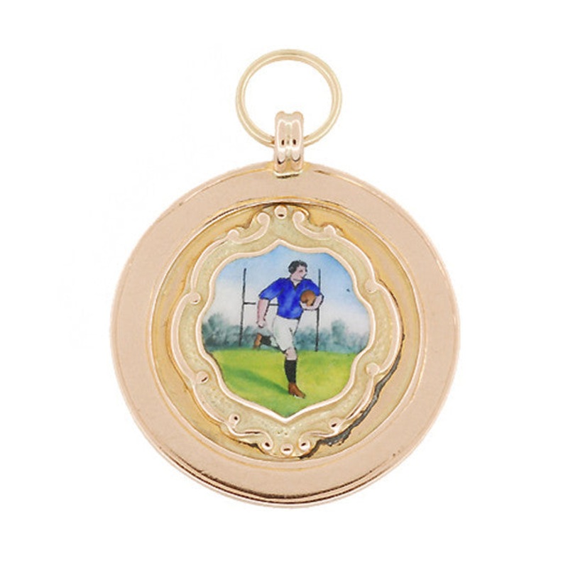 This unique enameled vintage rugby medallion in English 9K gold bears English hallmarks from the Chester Assay office dating it to the year 1924. The front of the pendant features a colorful enameled rugby player running across the field toward the goal post with the ball tucked tightly in the crook of his arm.