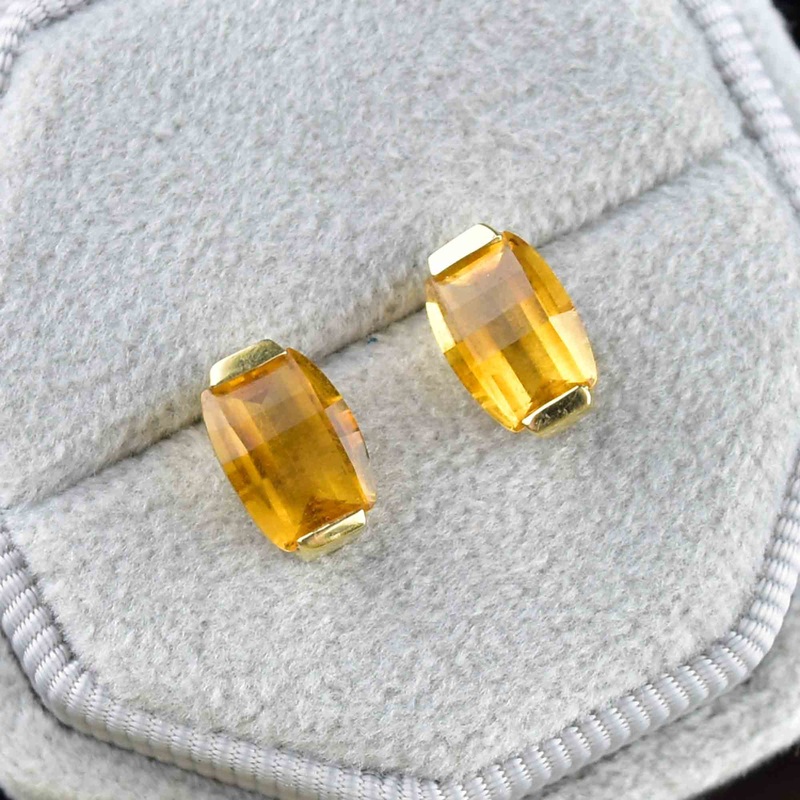 A timeless pair of vintage stud earrings, boasting dazzling natural citrine gemstones cut in a chic and sophisticated style and set in luxurious 14K yellow gold. The resplendent yellow gems flaunt natural inclusions and provide a bold touch to any ensemble