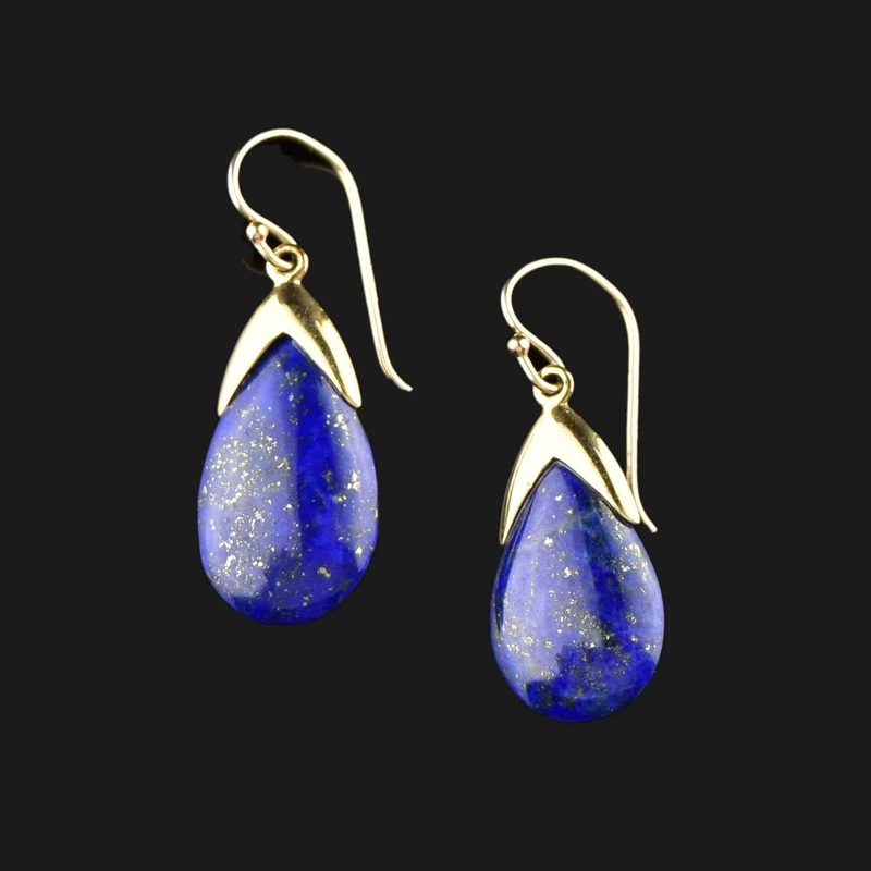 These vintage lapis lazuli earrings exude elegance and sophistication. Each earring boasts a stunning teardrop lapis lazuli stone adorned with a luxurious 9 karat yellow gold cap. The gems exhibit exquisite craftsmanship, showcasing beautiful flecks of gol