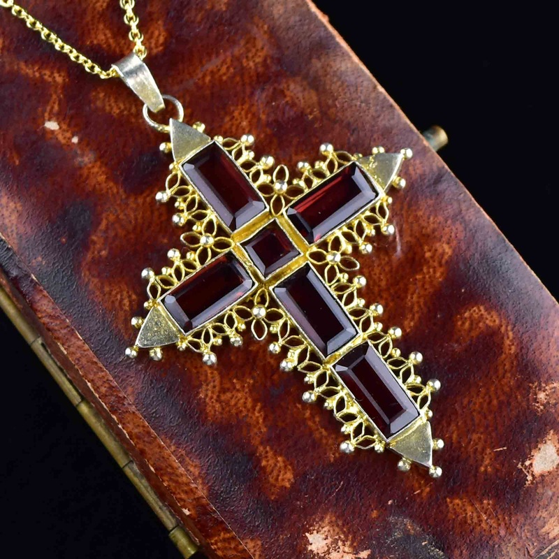 A jaunty Victorian-style sterling gold vermeil garnet cross pendant that'll stun! Each lustrous garnet flat top sparkles with the richest of reds. This beautiful religious jewelry is a gift sure to brighten anyone's day!Video available here...https://youtu
