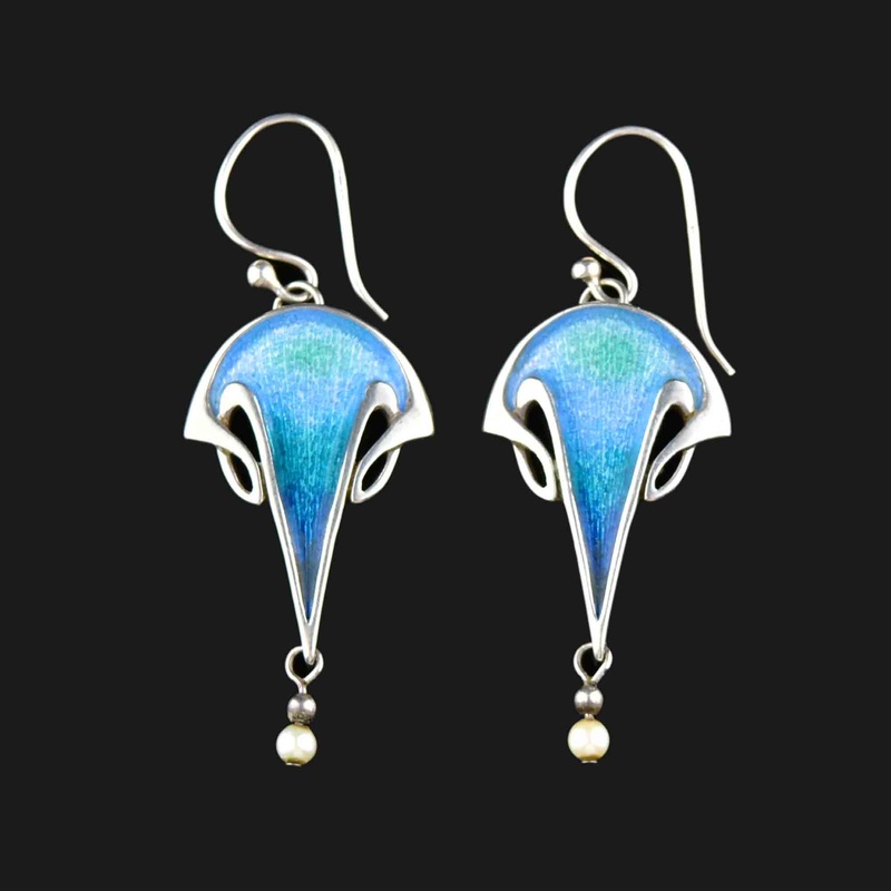 Spruce up your jewelry collection with these Malcolm Gray enamel earrings! Hanging from sterling silver shepherd hooks, the rich blue enamel is perfectly complemented by a delicate pearl, creating a charming Art Nouveau style. You won’t be able to resist this stunning pair!