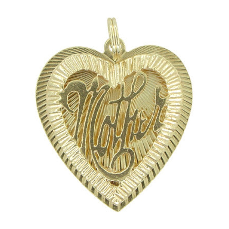 Circa 1960’s, this radiant 14K yellow gold heart shaped vintage pendant makes a perfect gift for a very special mother! Awash in engraved detail with light catching fluted edges, this wonderful pendant features a raised filigree “Mother” script design and measures 1 inch high by 15/16 inch wide, and features a 14K yellow gold split ring bail that makes this charm perfect to wear on a favorite neckchain or easily and securely attaches this charm to a charm bracelet.