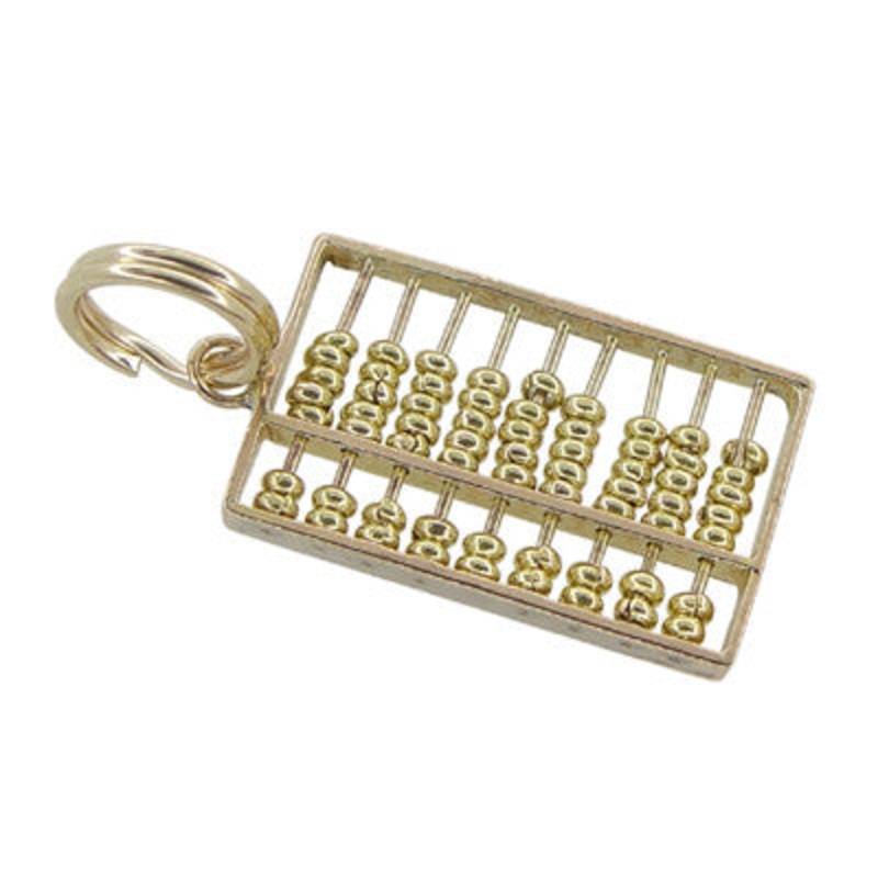 This miniature vintage abacus charm, circa 1950's, features real beads which actually move! Measuring 5/8 inch wide by 3/8 inch high, it has a 14K yellow gold split ring bail that makes this charm perfect to wear on a favorite neckchain or easily and secur
