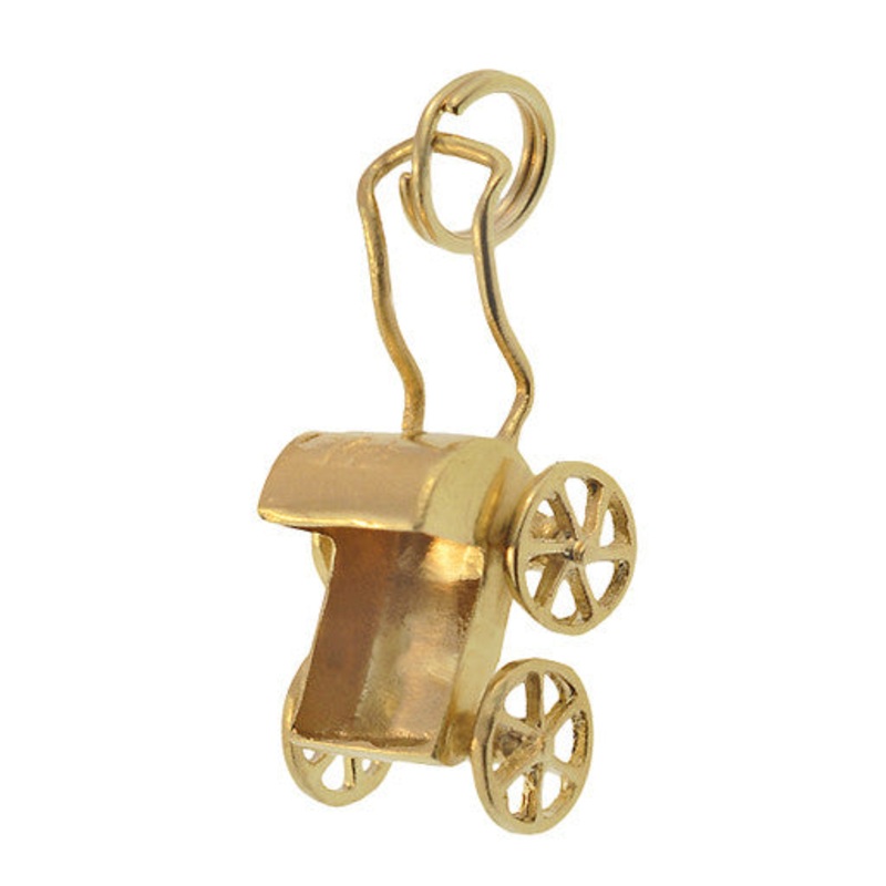Celebrate your most precious gift with this vintage baby carriage charm in 14K yellow gold. Circa 1950’s, this little buggy features wheels that actually roll! This beautiful three dimensional charm measures approximately 7/8 inch high by 3/8 inch wide. The charm features a 14K yellow gold split ring bail that makes this charm perfect to wear on a favorite neck chain or easily and securely attaches this charm to a charm bracelet.