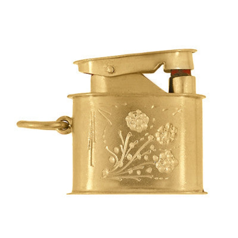 Circa 1950’s, this beautiful three dimensional cigarette lighter pendant in 18K gold is meticulously detailed with engraved flowers. This large movable lighter charm is perfect to wear on a neck chain or a favorite charm bracelet with large 1950’s charms.
