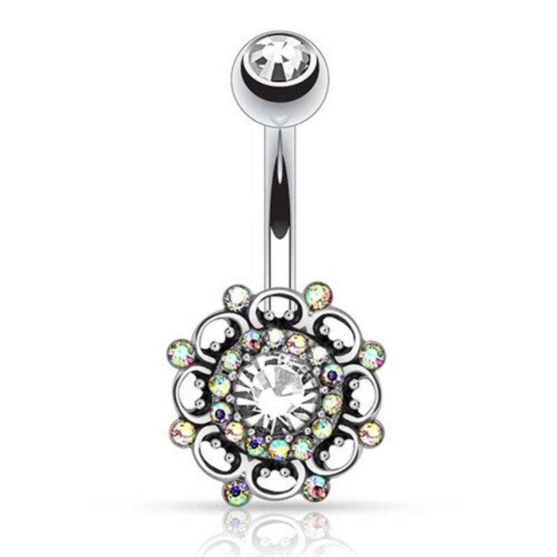 The 14 gauge vintage paved swirl belly ring is made from 316L stainless steel with external threading. Only the top 5mm ball is removable.