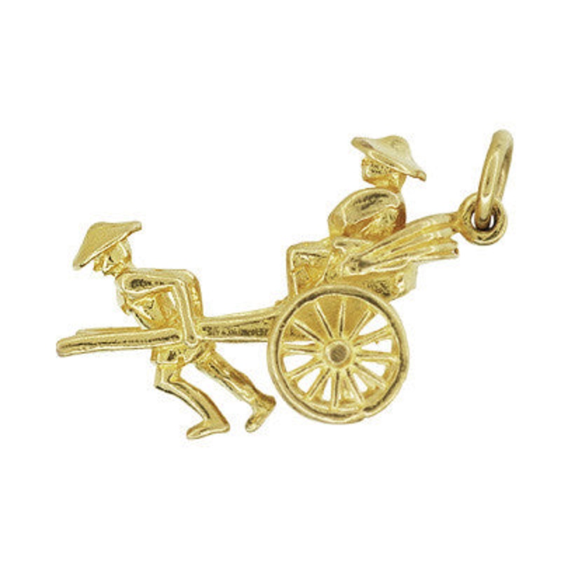 Celebrate your love of tradition with this vintage high polish rickshaw charm! Originating in Asia this 18K yellow gold piece depicts a member of the social elite being transported to his destination on a rickshaw. Measuring 5/8 inch long by 1 inch wide this rickshaw has wheels that actually move. Not to be missed, this piece will charm for years to come!