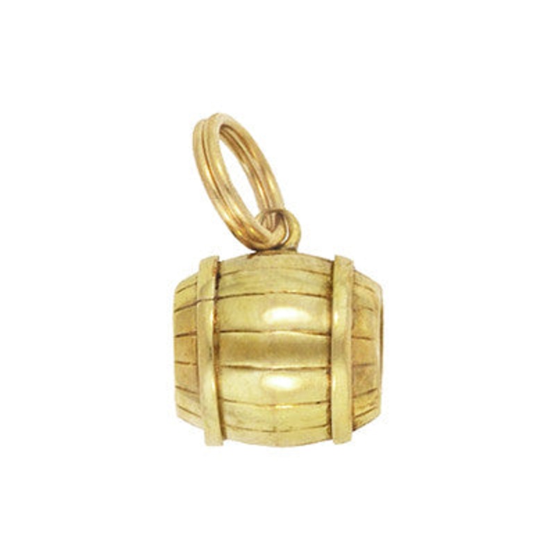 Circa 1950s, this vintage three dimensional 14K yellow gold barrel charm is meticulously detailed with wooden staves, and iron hoops. High polish and measures 3/8 inch long and 5/16 inch wide. The charm features a 14K yellow gold split ring bail that makes this charm perfect to wear on a favorite neck chain or easily and securely attaches this charm to a charm bracelet.