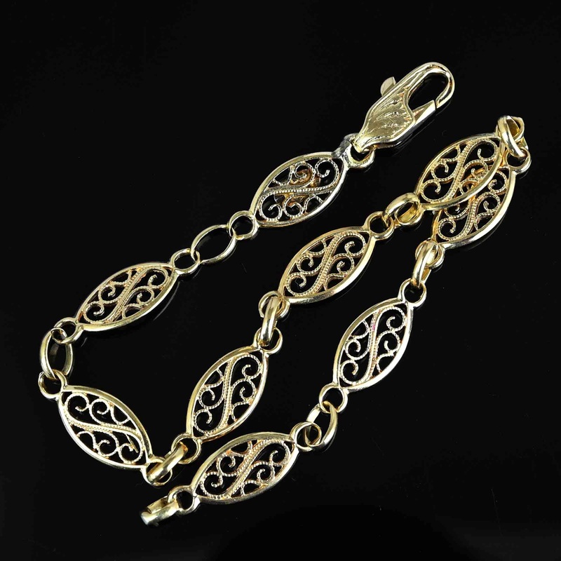 This elegant chain bracelet features an Edwardian-inspired design made of 14K solid gold. Each individual link showcases a delicate openwork filigree pattern accented with a milgrain beaded border. Secured with a fancy engraved lobster-style clasp, this Italian-made bracelet is perfect for stacking with other pieces or adding a feminine touch to any outfit.