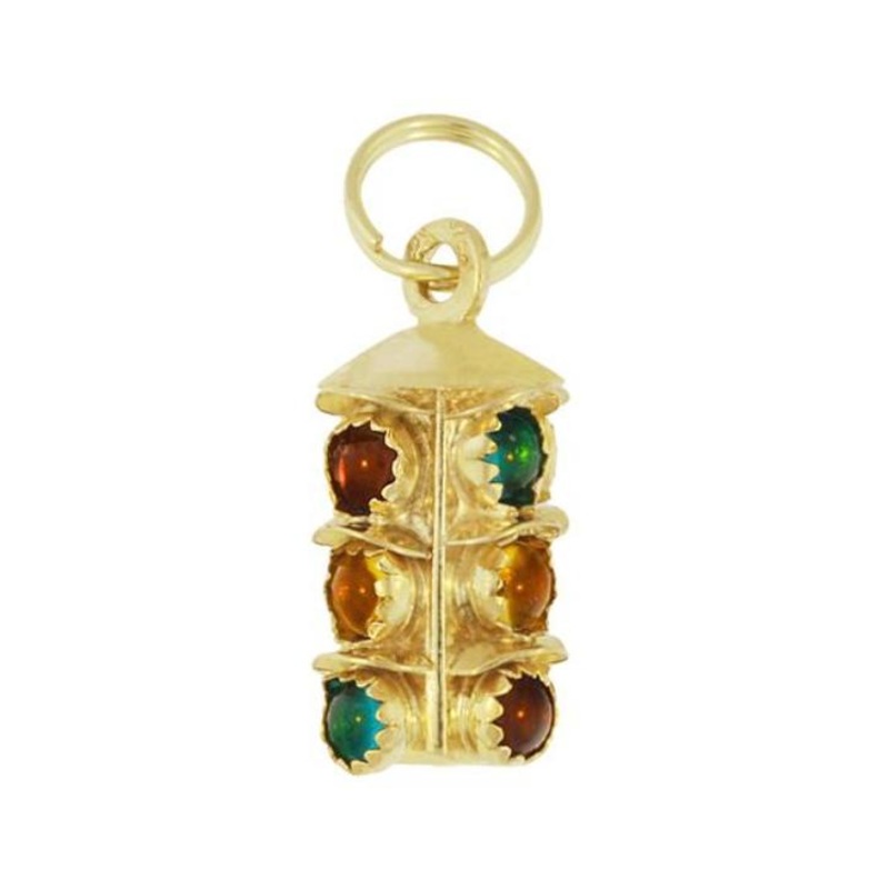 This unique transportation themed stop light charm has a 14K yellow gold split ring bail that makes it easy to wear on a favorite neck chain or to securely attach it to a charm bracelet.