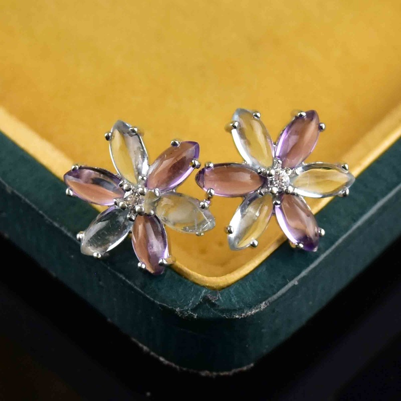 Discover the elegance of vintage floral earrings. These stunning stud earrings feature a beautiful arrangement of alternating amethyst and aquamarine gemstones surrounding a white zircon stone, all set in a 9k white gold frame. Perfect for adding a touch o