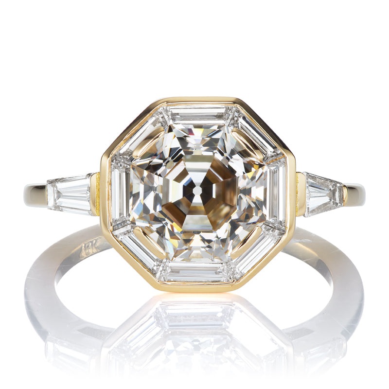 TheViveca 2.45 ring is an AB original design made right here in NYC. The ring centers a GIA-certified 2.45-carat Octagonal Step Cut diamond ofM Faint Brown color (read: a light a champagne),SI2 clarity. The stone is surrounded by a halo of8 baguettes with an additional baguette set on each shoulder of this lovely 18kt yellow gold setting. The ring is currently size6 and can be resized