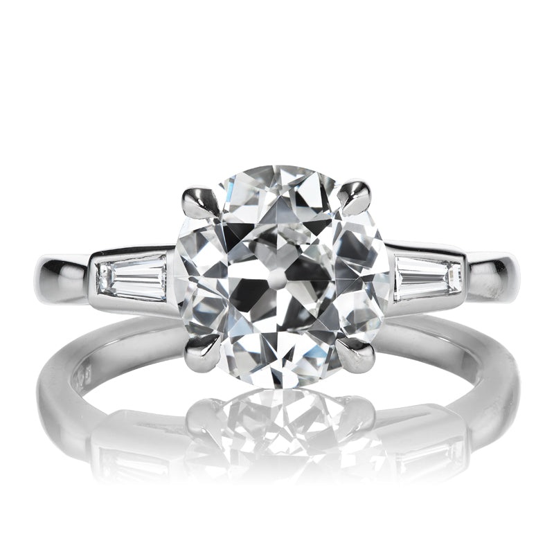 The Vivian 2.53 ring is an AB original design made right here in NYC. The ring centers a GIA-certified 2.53-carat Old European Cut diamond of H color, VS2 clarity. The stone is set in a four prong platinum setting with a tapered baguette to each side. The ring is currently size 6 and can be resized!
