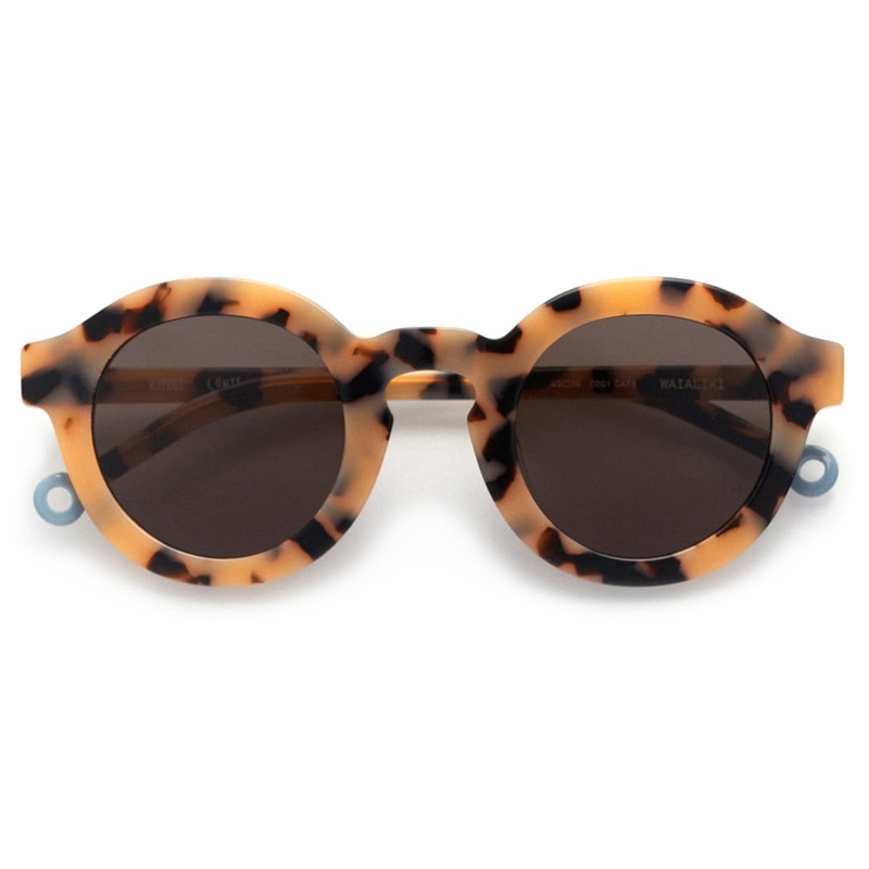 The Kaleos // Waialiki offers a round shape sunglass for kids crafted out of light and durable acetate. This frame features contrasting rounded tips with an eyelet to attach a clasp of a chain. Kaleos case, cleaning cloth, and 2-year manufacturer's warrant