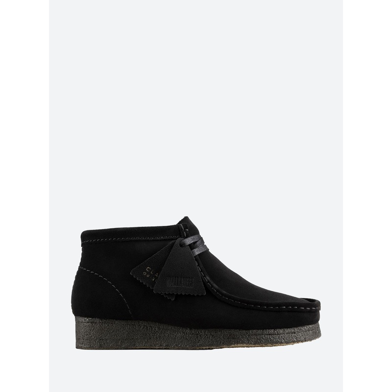 Clarks Originals Wallabee Boot featuring clean and simple lines in black suede. An iconic classic across the globe.Ankle heightLace-up closureStructural silhouetteMoccasin toeSignature crepe soleMaterialsUpper suedeLining: sheepskinOutsole: rubber crepeSiz