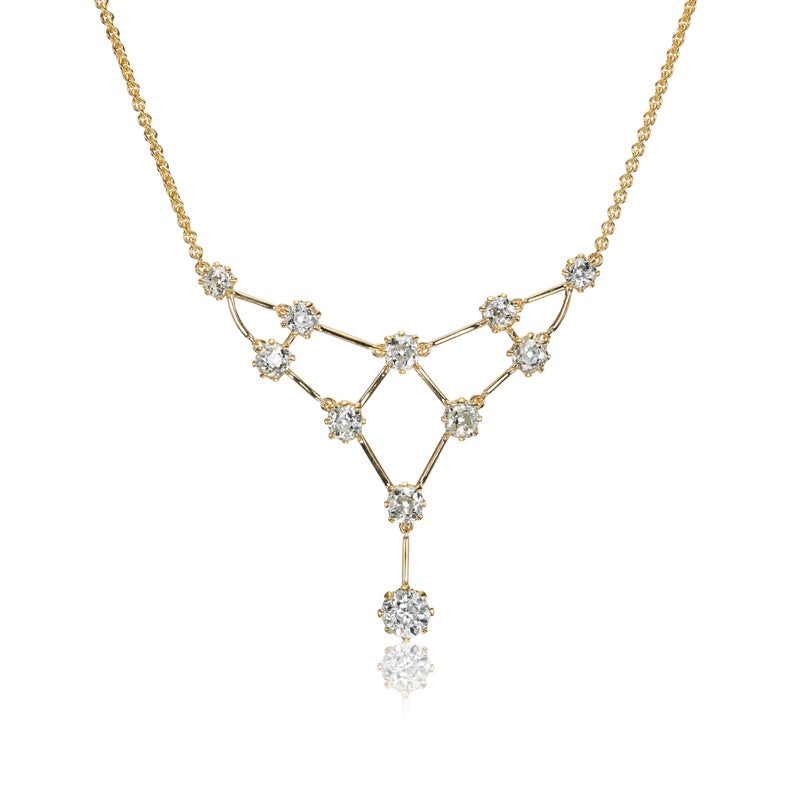 This beautiful necklace is a design based on an original antique piece. We hand picked authentic antique diamonds to glitter in this charming and whimsical piece.