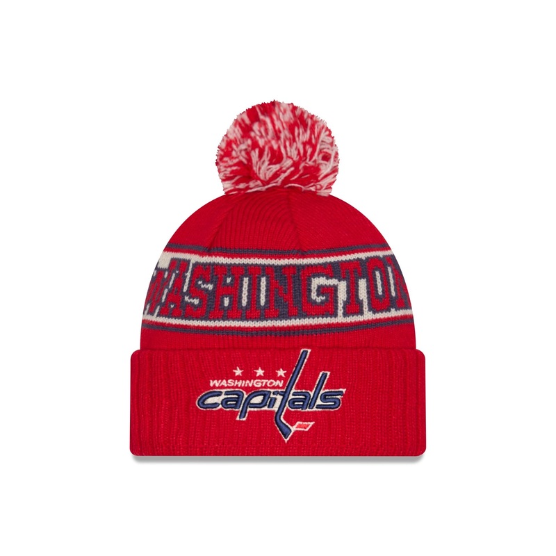 The Washington Capitals Retro Pom Knit Hat features an embroidered Capitals logo at the front cuff with a team wordmark at the crown and a one-time removable pom.