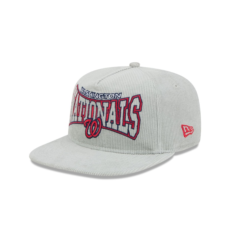The Washington Nationals Gray Cord Golfer features an embroidered Nationals wordmark and logo at the front panels against a gray corduroy fabrication throughout. Additional details include a matching snapback closure at the rear and a gray undervisor.
